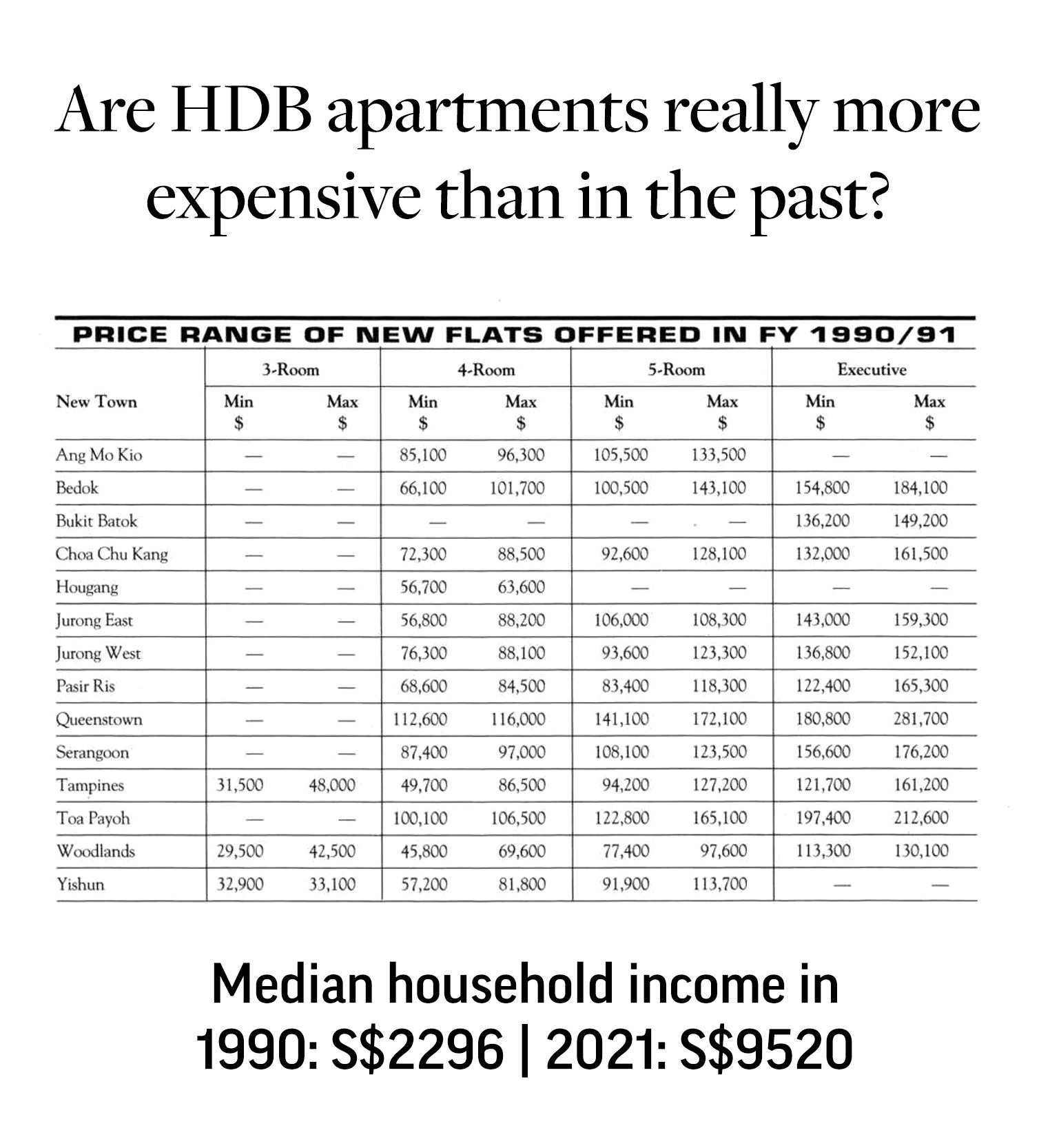 And since the earliest reliable median household income data I had access to was from 1990, I decided to compare it with the HDB report from just that year, three decades ago.