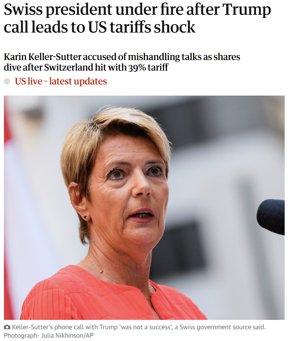 Quote from the Guardian article: "Switzerland, home to some of the world’s best-known luxury brands, was left stunned after the US president on Friday imposed one of the highest tariff rates in his global trade reset. Industry associations said tens of thousands of jobs were at risk.