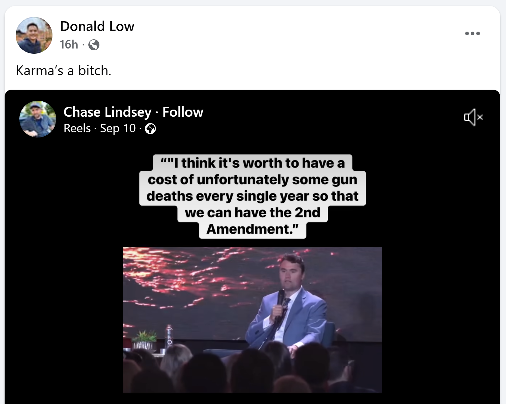 Yes, the professor in practice at the Hong Kong University of Science and Technology shared an edited, cut clip of Charlie talking about second amendment rights, manipulated in a way I described in my previous Facebook post: removing the entire argument that Kirk made in its defence.