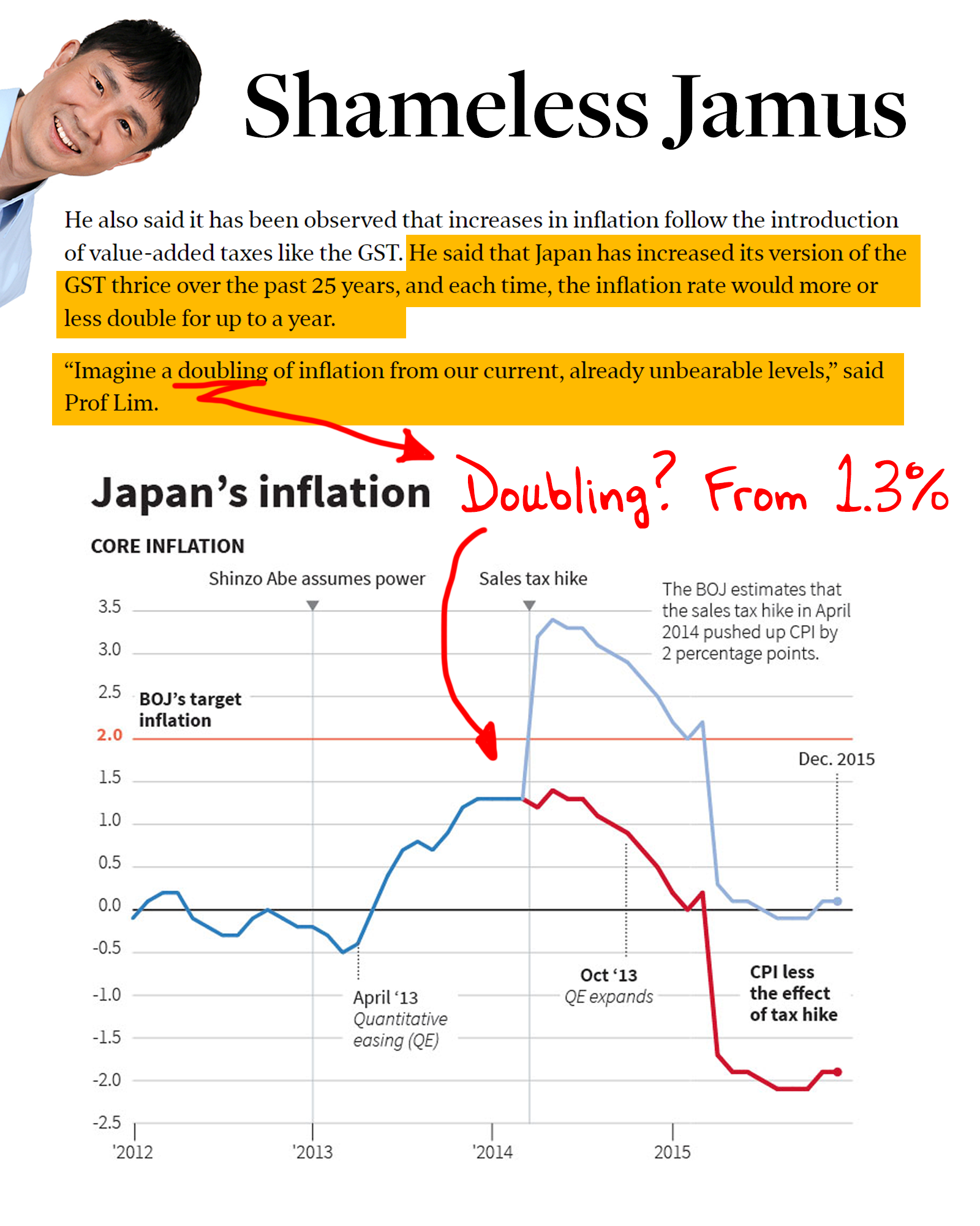 In other words, he's trying to claim the GST hike could double the rate of inflation, based on Japanese experiences...