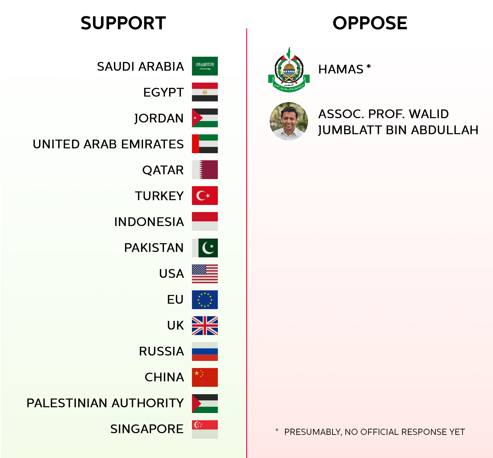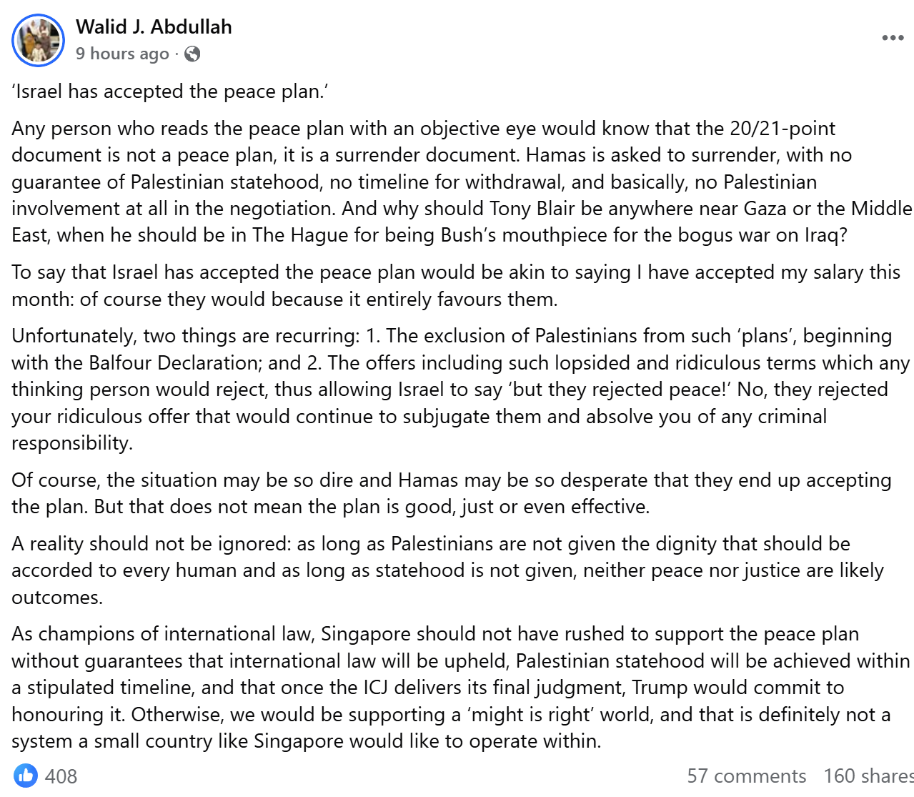 Oddly enough, he mentions Hamas twice and criticises Singapore's government for "rushing" to support the peace plan, but makes absolutely no reference to the fact that the plan has been vocally supported by countries all over the world, including Arab/Muslim nations: