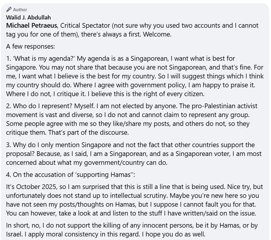 The outspoken Palestinian supporter who tacitly excused Hamas' butchery by saying that "omitting history before Oct 7 would be ‘intellectually dishonest’." has now taken issue with Singapore's support for the Gaza peace plan.