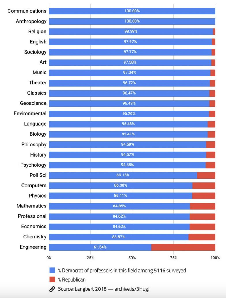 That left-wingers would lament it is quite comical considering that they have managed to very nearly exterminate conservatives from their ranks, according to several studies on political alignment of American academics: