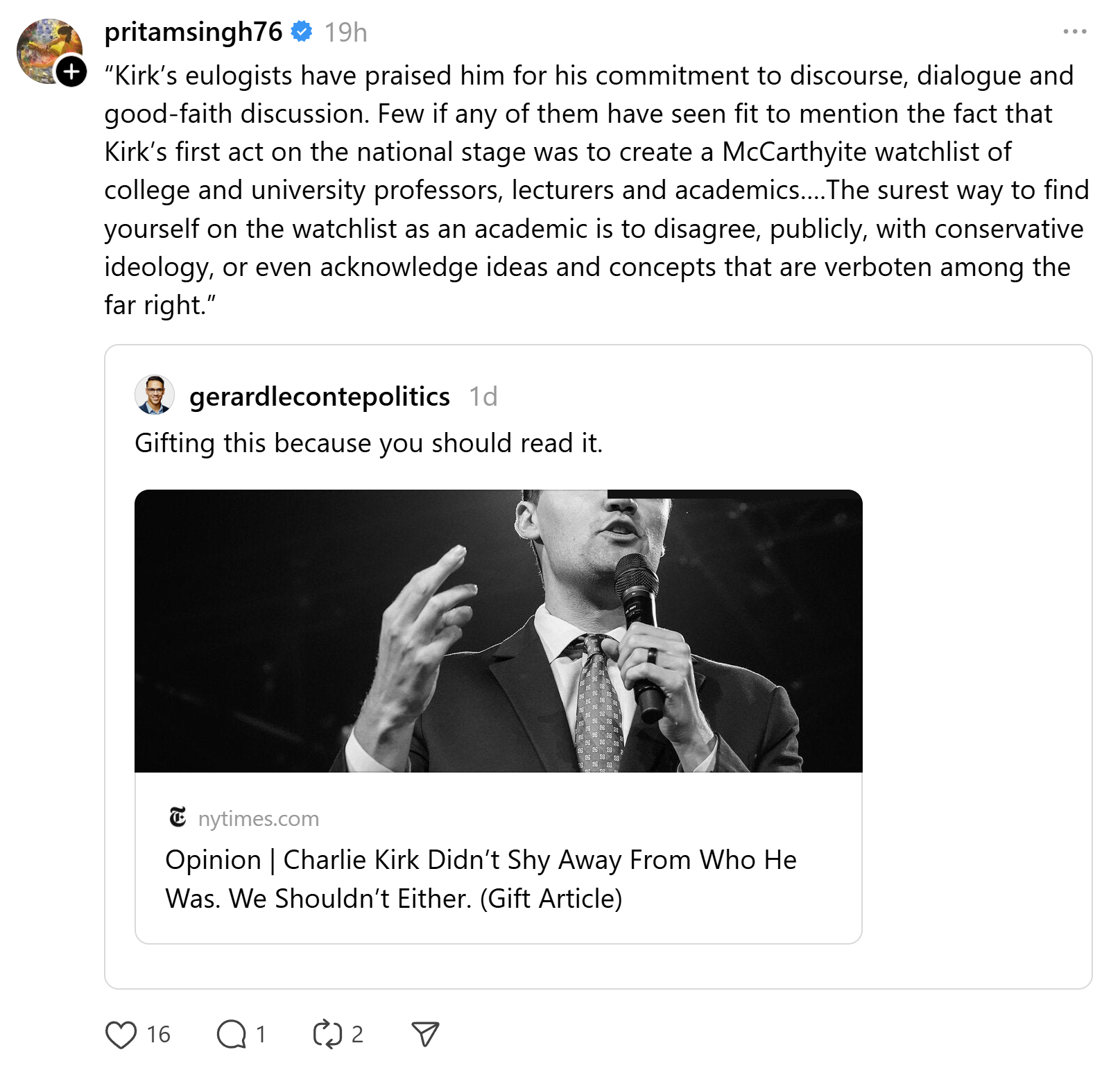 I have to say I was quite shocked when a reader shared with me what Pritam Singh shared on his Threads profile following Charlie Kirk's assassination a few days ago.