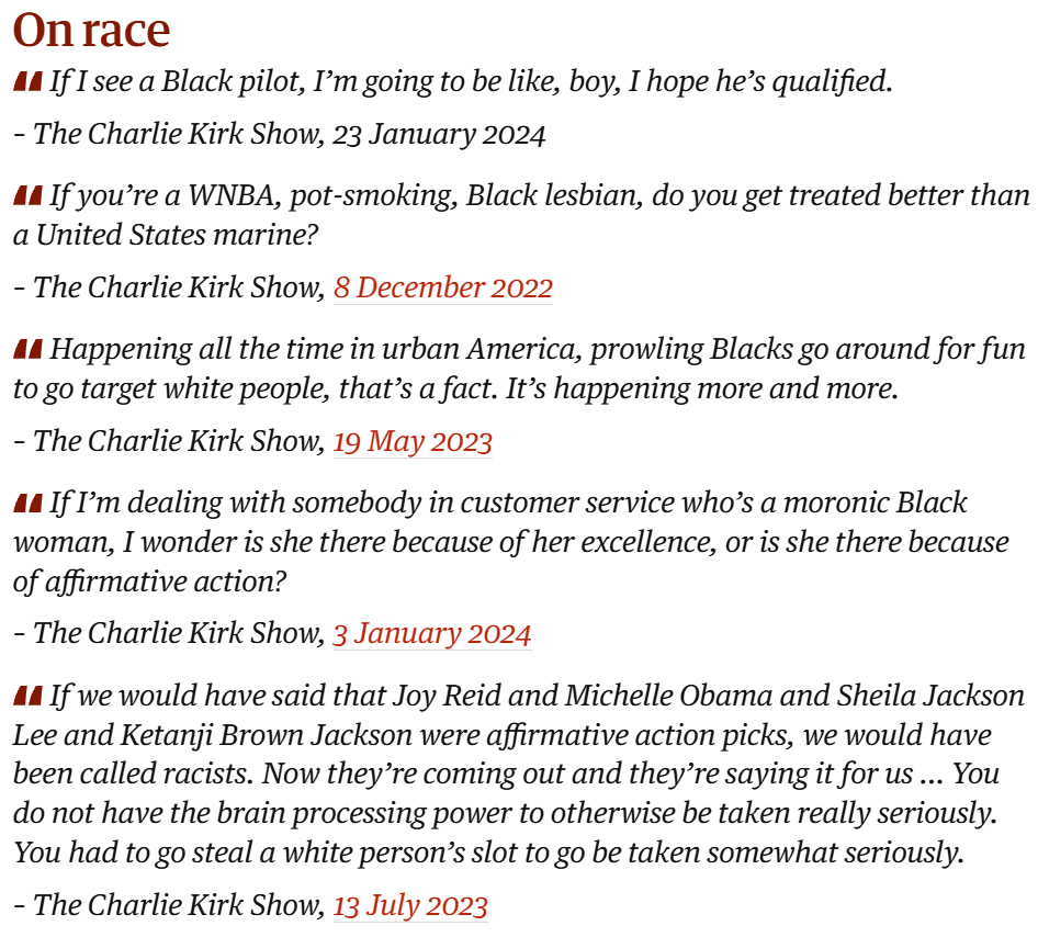 The author of the article claims to be quoting Kirk, but in reality it's just the same array of misleading one-liners taken out of context to frame the slain conservative as a racist or worse.