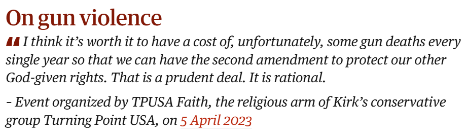 But that's not all. The same article goes to quote Kirk out of context on the same topic of gun violence that I already explained in my Facebook post here: