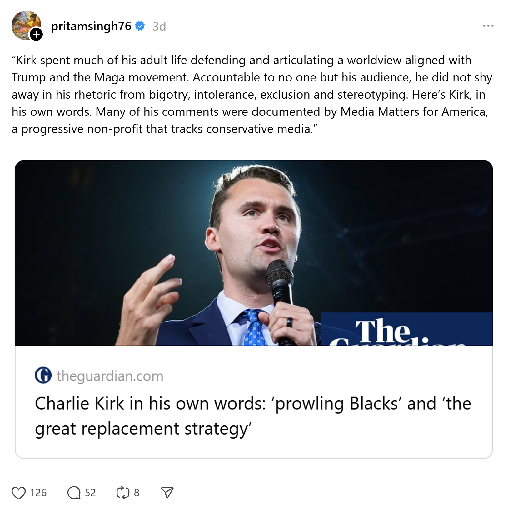 On Friday, barely a day and some change after Kirk's murder, he shared an accusatory article by a known British left-wing outlet, The Guardian:
