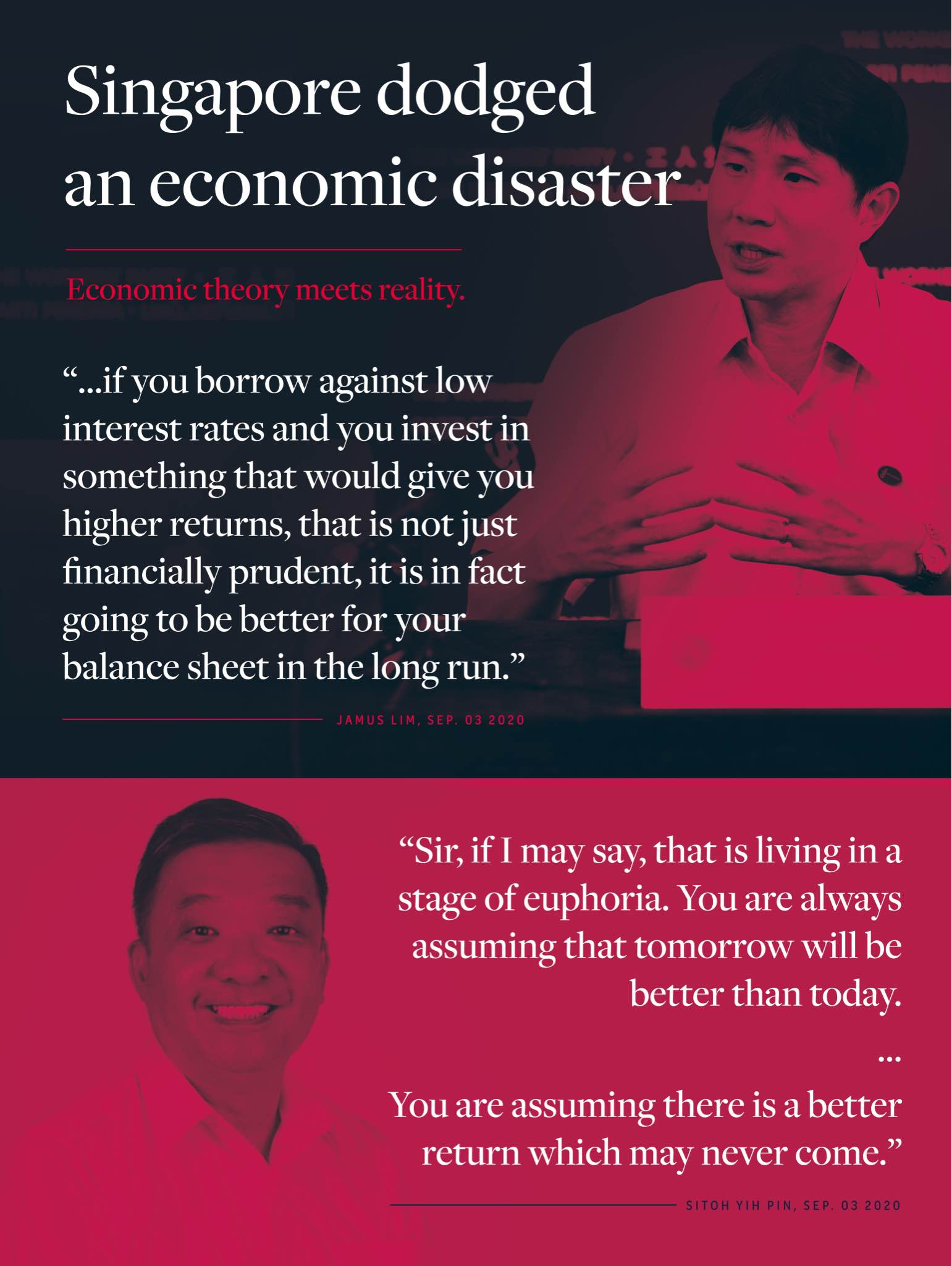Before making any policy recommendations it would be advisable for Jamus Lim to have thought about an alternative scenario. What if interest rates suddenly spike? What if the world is shaken by record inflation? What if a nutcase in the Kremlin starts a war?