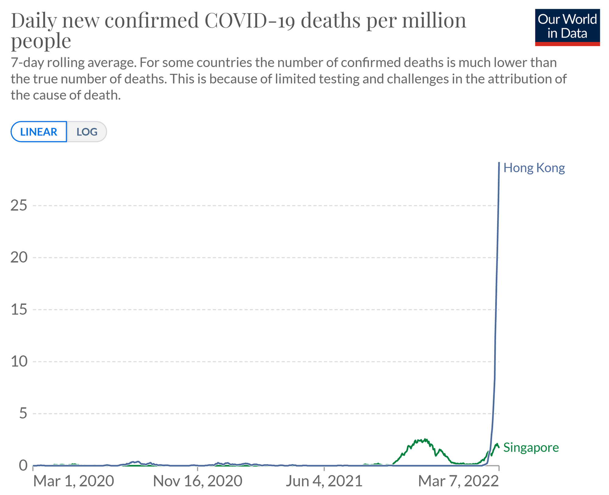 Their current outbreak is nothing like what Singapore has ever had to face and their deaths per 1M people are already nearly double - with close to 340 vs. Singapore's 183 - and growing rapidly every day.Only 25% of Hongkongers received the booster shot (compared to 65% of Singaporeans) and the majority (about 60 to 40%) chose Sinovac over Pfizer mRNA vaccine, which offers much greater protection vs. Omicron (ca. 90% to just 36% for the Chinese vaccine, after three doses).