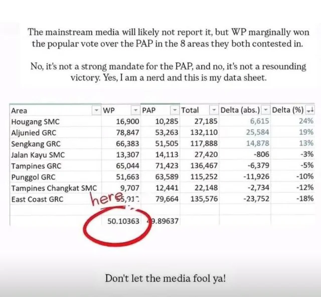 Just like five years ago, the party marginally crossed the 50 percent threshold in the combined vote share across all of these areas – a result its supporters frame as evidence that the election didn’t go quite as well for the PAP. They argue that, if only the WP could contest the entire country, it might even defeat the PAP.